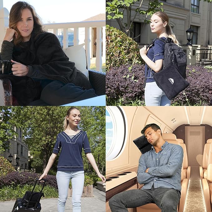 - Special Feature : Airplane Travel Accessories - Travel must haves for airplane as it weighs less than 1lb, so you can just easily carry it around for long flights., Micro Plush Blanket - The black travel blanket features a unique patented design that keeps you warm and comfortable in all seasons., Plane Blanket Travel - The outdoor blanket is large and has a sleek, matching travel bag with a hand luggage belt., Travel Bag - This airline blanket is an easy-to-fold travel blanket and fits into our portable zipper pouch, Travel pillow blanket: Use it as a blanket or a pillow on planes, in RV, in cars, on trains, along with the travel case. Airplane Travel Accessories - Travel must haves for airplane as it weighs less than 1lb, so you can just easily carry it around for long flights., Micr… See more