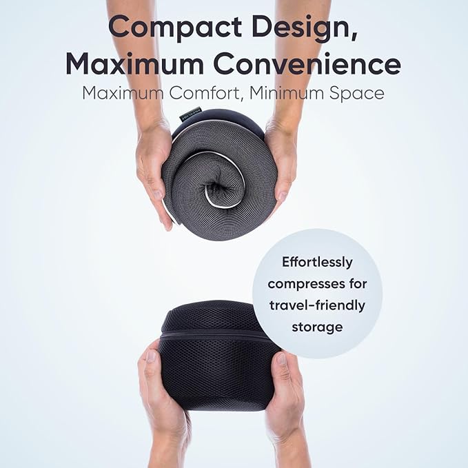 - Great portability – The neck pillow is compact, lightweight, and effortlessly rolls into a compact form, making it an essential for airline travel. It easily folds into the luxurious mesh carry bag, which can be snapped onto carry-on luggage for optimal convenience. Perfect for use on airplanes, trains, cars, buses, camping, or wherever you go. Additionally, it features a removable, washable outer cover that is breathable and easy to clean.